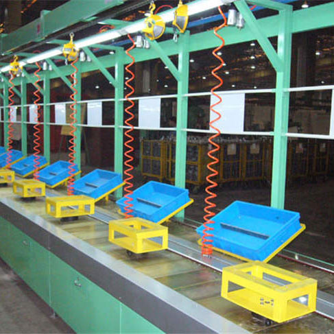 发动机装配线主要包括总装线、分装线、工位器具及线上工具等。在总装线和分装线上,目前国内普遍采用强制或柔性输送线输送工件,并在线上配置自动化装配设备以提高效率。强制输送线主要是板链输送线配装配夹具。柔性输送线主要有:差速链线和动力辊道两种。装配线上的自动化设备主要有自动打号机、拧紧机、自动翻转机以及其它专用装配设备等,可大大提高装配线的装配能力。